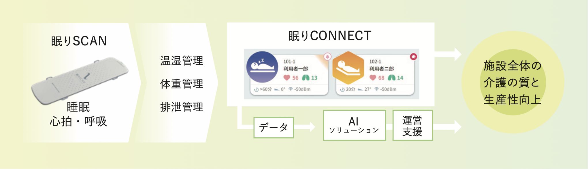 「眠りCONNECT」「眠りSCAN」など、DXで介護施設のケアの質向上、業務負担軽減を実現します。
