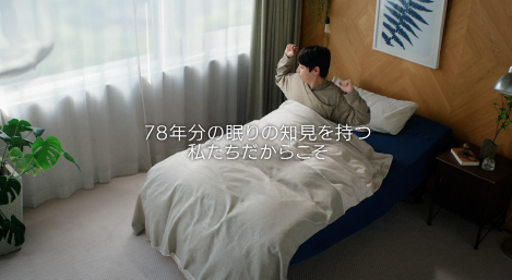 新CMでは、医療・介護の現場で培ってきた78年の知見を振り返りながら、良い睡眠がすべての人の笑顔につながり、やがて学校や職場、そして社会全体にウェルビーイングが広がっていく様子を描いています。「睡眠を通じて、すべての人を健康に、そして笑顔に。」という想いを込めて、当社が掲げるブランドメッセージ WELL-BEING for all beings を映像で表現しました。